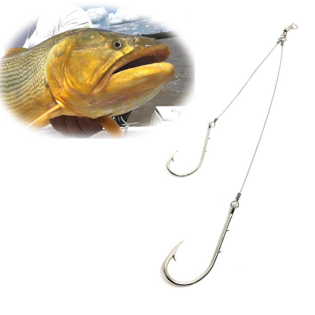 Indicado para pesca de dourado, ideal para iscar tuvira e Piau prendendo a isca em dois anzóis para melhorar a eficiencia das fisgadas. Composto por anzois MS 4330 N. 8/0 e 6/0 encastoados com girador e fio de aço.