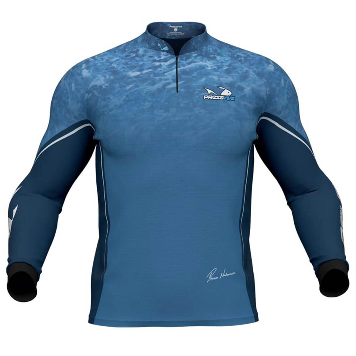 Camiseta sublimada Presa Viva Tecnologia Dry que proporciona máximo conforto térmico durante a atividade, modelo raglã manga longa, fechamento com zíper.
