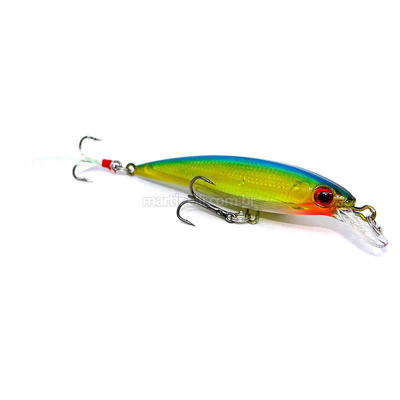Isca de meia água com excelente acabamento e garatéias reforçadas. Contém penacho atrativo na garatéia e efeito sonoro. Tamanho: 8,5 cm Peso: 8 g Ação: Meia água suspend Profundidade: 0,5 a 1m