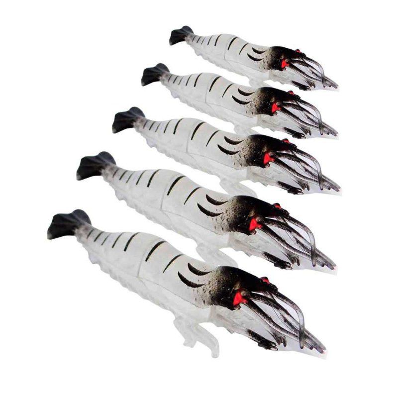 Descrição do Kit 5 Unidades de: Isca artificial Camarão Robalo fumacinha 9 cm .Isca de camarão artificial feita de silicone, ideal para pescas com anzol Jig Head (não incluso na compra). 9cm