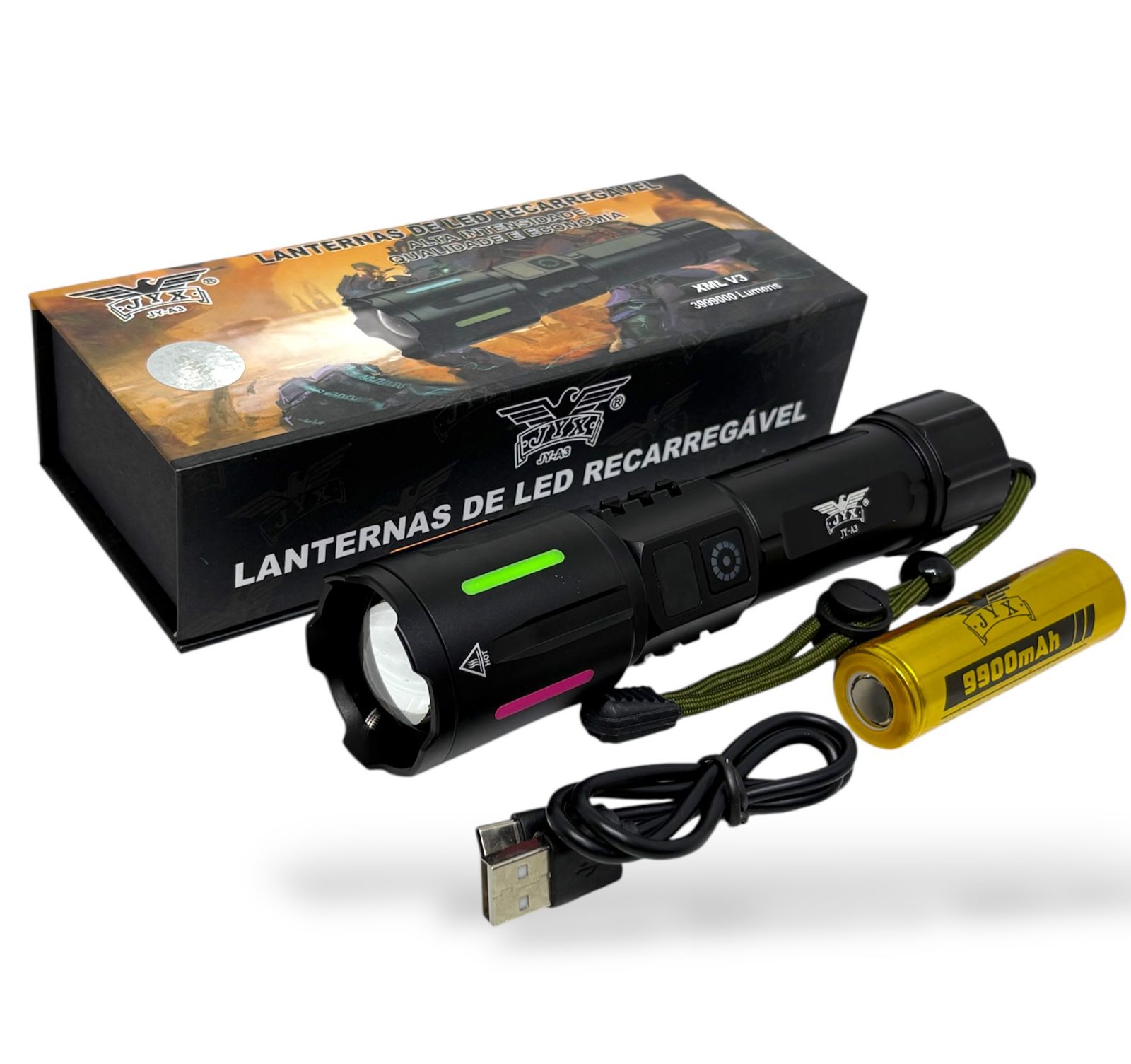 Lanterna JY-A3 * LED de mão, com foco laser branco ajustavel, corpo colorido, bateria recarregável, cor preta.