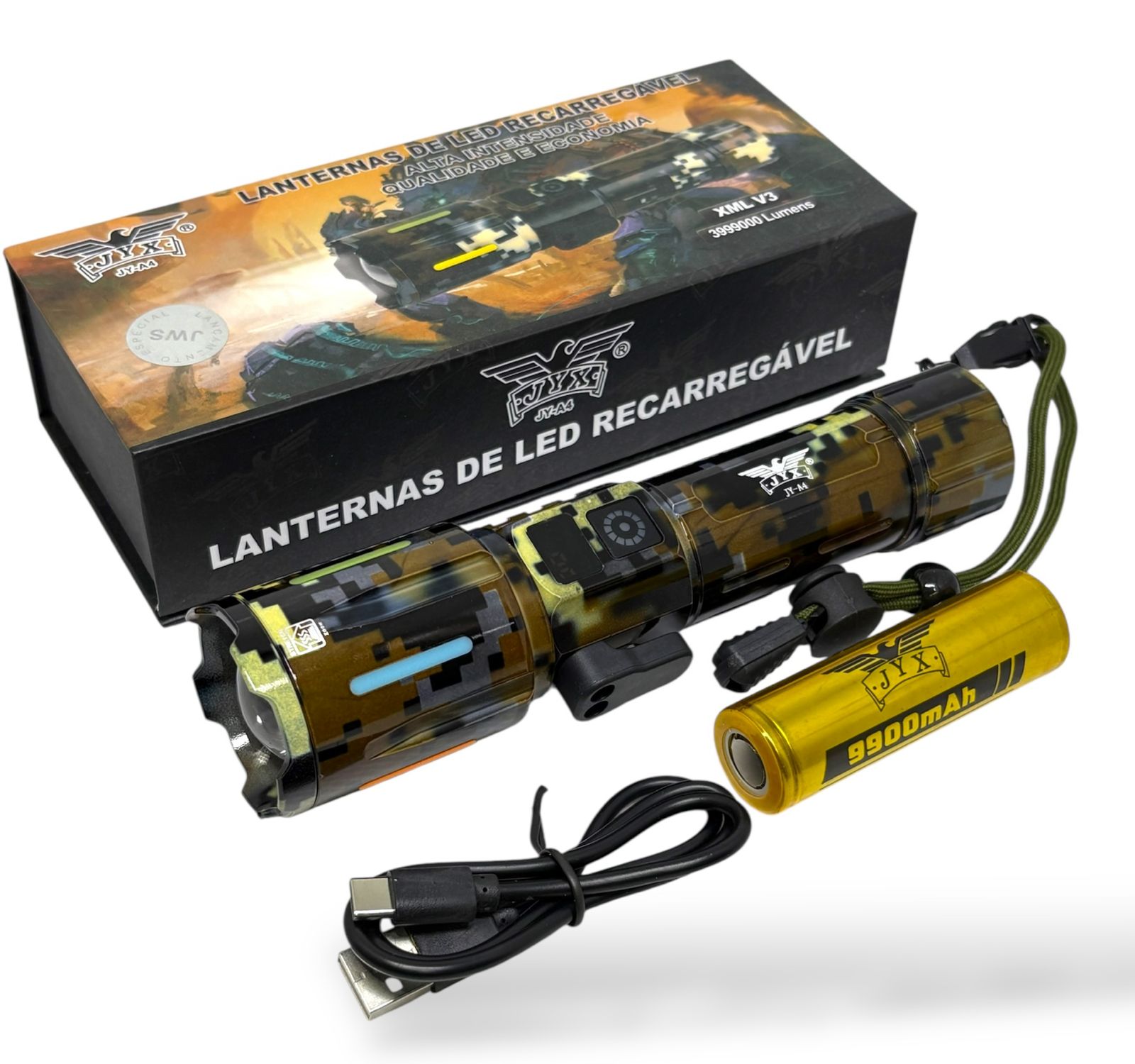 Lanterna JY-A4 * LED de mão, modelo militar, com foco laser, cor camuflada, bateria recarregável