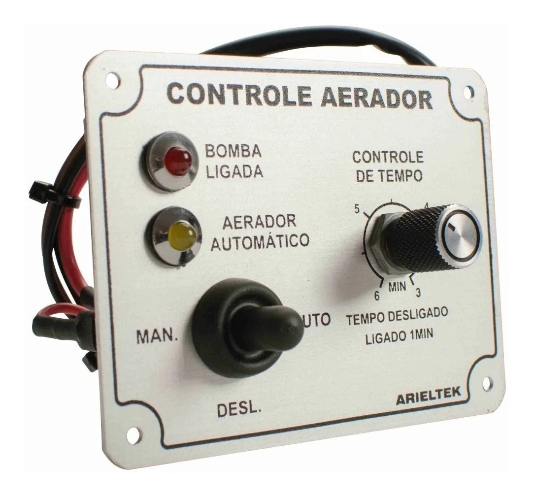 O Painel de Controle do Aerador consiste de um sistema temporizador que controla o tempo de funcionamento da bomba de aeração (Até 5A). No modo AUTOMÁTICO mantem a bomba ligada por 1 minuto e desliga durante o tempo ajustado, que varia de 3 a 6 minutos, podendo ser ajustado a qualquer momento. No modo MANUAL, a bomba será desligada apenas quando a chave for desativada.